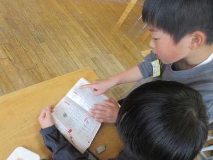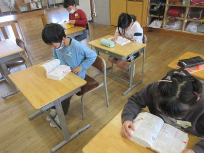 国語科の学習で、国語辞典の使い方を学習しました。「たくさんの文字が書かれている」「言葉はどんな順で並んでいるのだろう」と、気づいたことを交流したり言葉の探し方を学んだりしました。