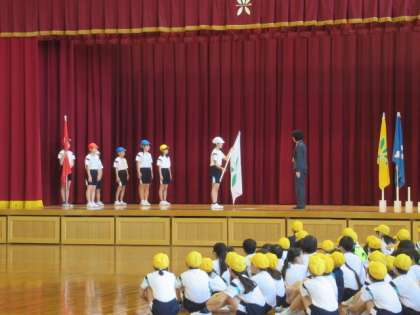 校長先生から団長に各団の団旗が渡されます。実際の重さ以上の重みを感じます。