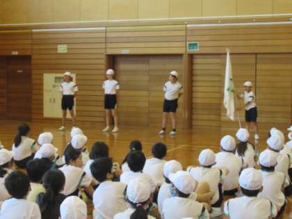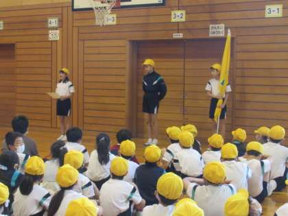 結団式の後半は、体育館で団ごとに意気込みの紹介をしました。さっそく声の大きさの競い合いです。