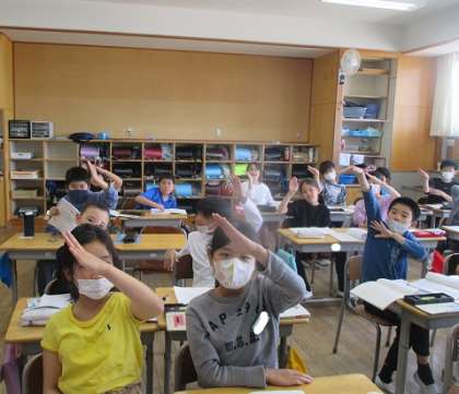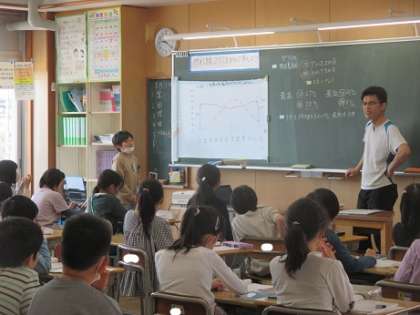 算数科「グラフや表に表そう」の学習では、変わり方を調べる際に折れ線グラフで表すと分かりやすいことを学びました。線の傾きに注目しながら、適切にグラフを読み取ろうとする子供たちです。