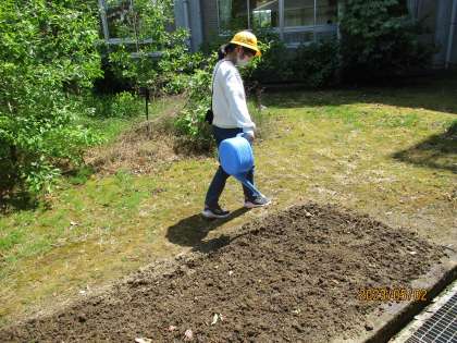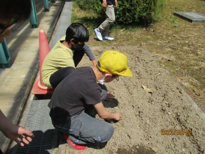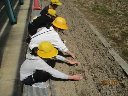 各学級の栽培委員や生き物係が中心となって、理科の学習で使用するジャガイモを畑に植えました。温かい日光を浴びて大きく生長するよう、欠かさず水をあげようと思います。
