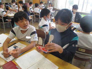 腕を曲げると、筋肉が出ることに疑問をもった子供たちは、モデルを使って熱心にしくみを調べています。