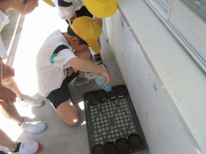 「ホウセンカ・ヒマワリ・ピーマン・オクラ」の種まきをしました。ほぐした土をそっとかける姿が印象的でした。これからみんなで大事に育てていきましょうね。