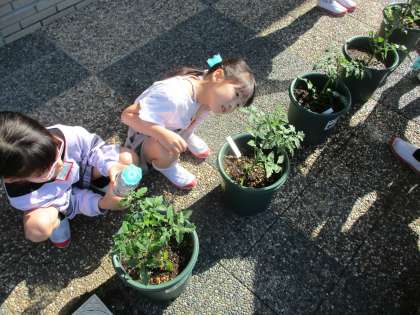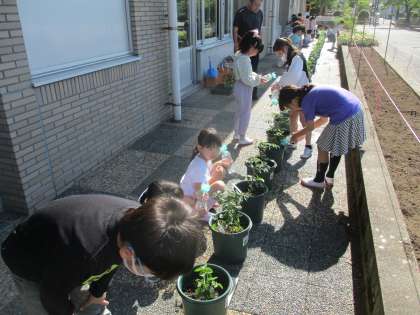 子供たちは、準備が終わるとすぐに野菜の元へ行って、水やりをしたり観察したりしています。「元気か見てくる!」「水をあげなくちゃ!」と、一生懸命お世話をする様子があちこちで見られます。