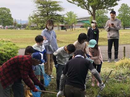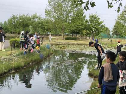 今回は、布瀬南公園のビオトープ清掃も行いました。池のごみや藻をすくい出しながら、いろいろな生き物の観察もしました。ちっちゃなおたまじゃくしがたくさんいることに、子供たちは歓声を上げていました。