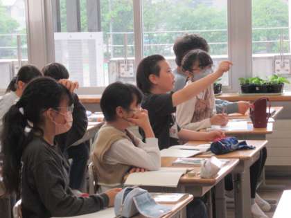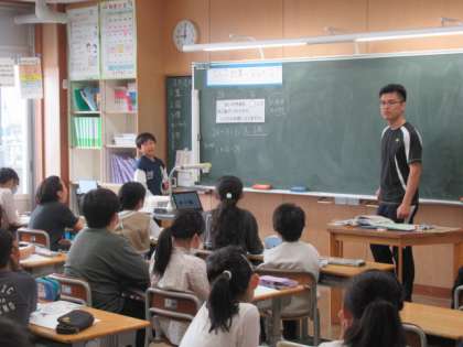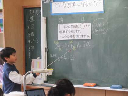 「□枚の紙を〇人で同じ数ずつ分けます。一人分は何枚になりますか。」の問いについて考えました。進んで前に出て発言をする子、その発言から自分の考え方を関わらせていく子、それぞれ活発に意見交流をしながら、思考を深めていきます。