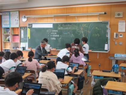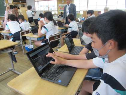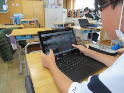 輪中で暮らす人々の暮らしの様子について学習しました。木曽三川に挟まれた地域の方々は、高い堤防を築くことで暮らしを守っていることをクロームブックで確かめていきました。