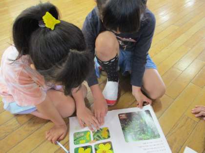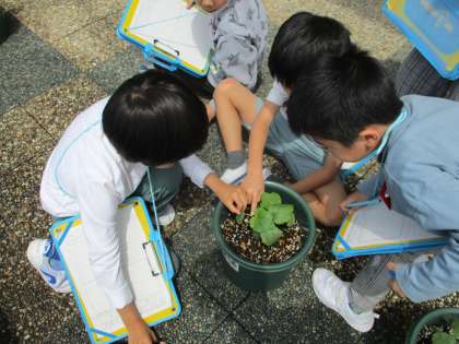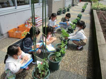 野菜の様子を観察しました。土日が終わって、少し成長してきた野菜たち。「倒れてきたから支柱が必要かな・・・。」「脇芽があるよ。取ってもいいのかな。」不思議に思ったことは、本で調べたり友達に聞いたりして、お世話の仕方を考えています。
