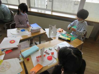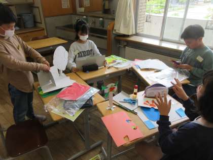 図画工作科「くるくるランド」の作品作りを進めています。くるっと回して面白いものを考えて、工夫して表そうとしています。