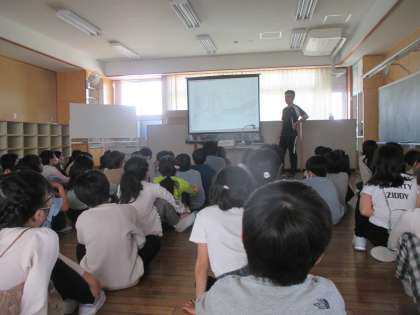 どんな活動をするのか、わくわくした表情で先生の話を聞く子供たちです。