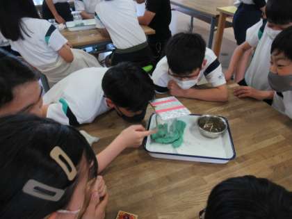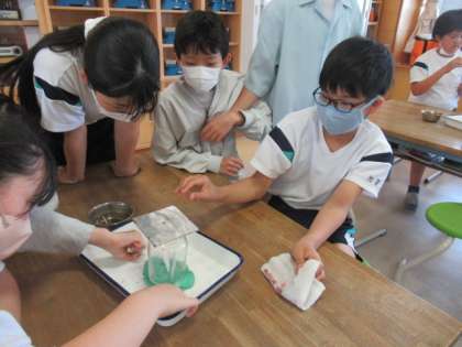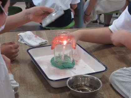 実験の真っ最中。子供たちは、一本の蝋燭の火を真剣に見つめています。
