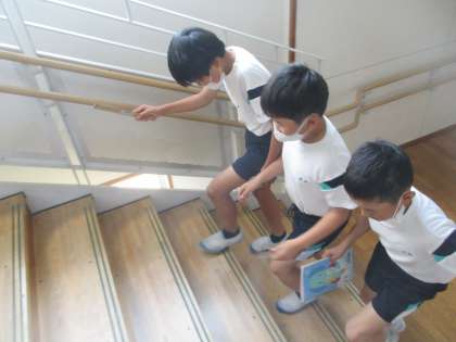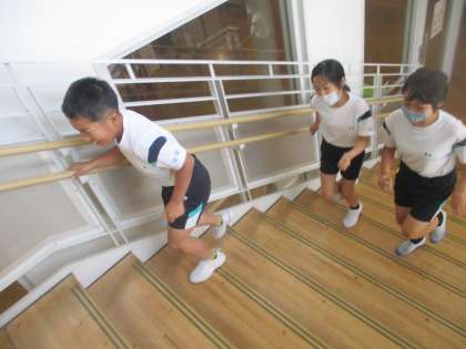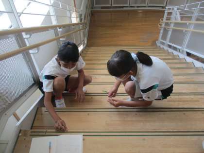 算数科で「比例」の学習をしています。今日は比例の特性を活かして、光陽小学校の1階から3階までの階段の数を数えて、小学校の高さを調べました。比例を使うといろいろなことが調べられることを学びました。