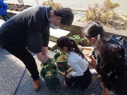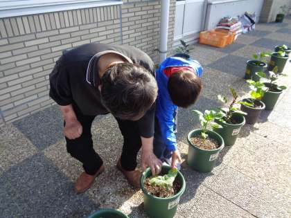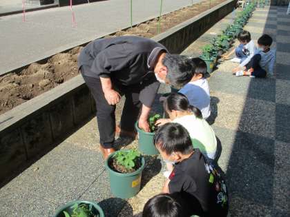 みんなの野菜のお世話の様子を見に、地域の方が来てくださいました。間引きの仕方や支柱の立て方、肥料がいるかどうかなど、たくさん教えてくださいました。