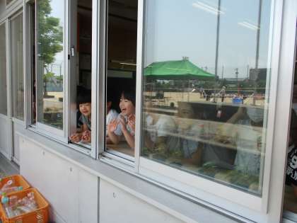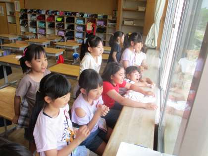 今日ののびのびタイムに、高学年の騎馬戦の予選が行われていました。太鼓の音と、かっこいい高学年の姿に、自然と窓に集まってきた子供たち。一生懸命応援しました。かっこよかったですね!
