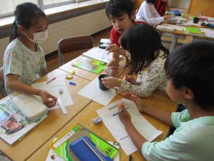 理科の学習で植えた植物の芽が出ました。最初に出たのはヒマワリでした。色や形、大きさを観察しました。