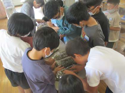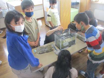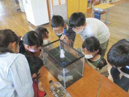 理科の学習でメダカを育てることになりました。自分たちで飼育方法を調べたり、メダカに名前を付けたりして愛情いっぱいにメダカを育てようとしている子供たちです。