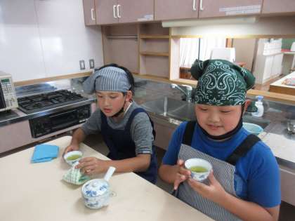 「班で協力してお茶をいれよう」という学習課題のもと、やかんで湯を沸かして緑茶を入れる実習を行いました。