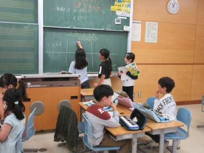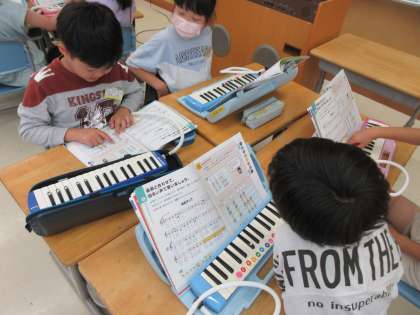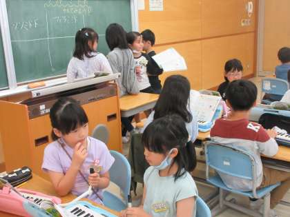 「海風にのって」の演奏部分をグループごとに考えました。学級のみんなに聴かせたり、他のグループの演奏を聴いて違いに気づいたりしました。