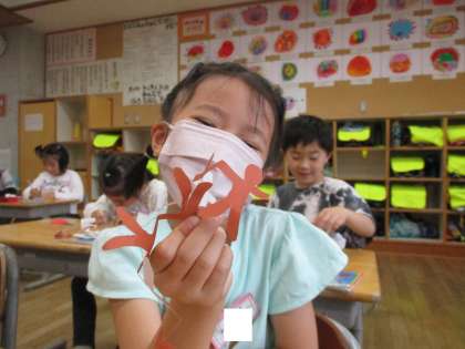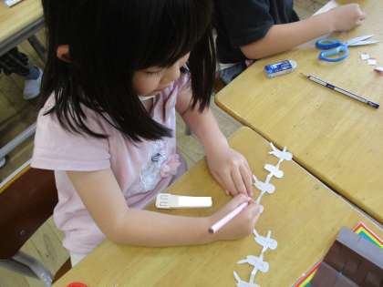 図工の学習では、折り紙とはさみを使って「ちょきちょきかざり」をつくりました。鉛筆で慎重に切り目を書き、ちょきちょき切ると、、、「わぁ!かわいい!」と出来上がったかざりを見てにっこり笑顔の子供たちでした。