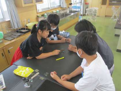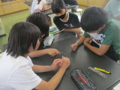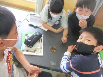 理科の実験で、発芽前のインゲン豆と発芽後の子葉をヨウ素液につけてみました。すると、発芽前のインゲン豆だけが青紫色に変化しデンプンが多く含まれていることが分かりました!実験を通して学びを深める子供たちです。
