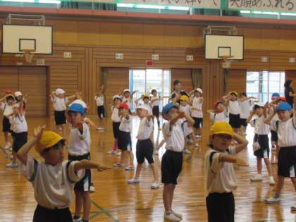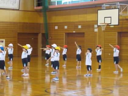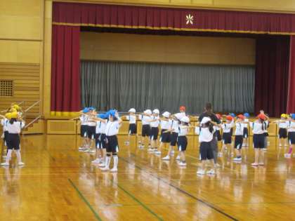 ボールを遠くまでとばすには、正しいフォームを身に付けることが大切です。今日は、みんなで投げ方の確認をしました。