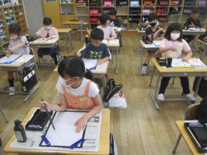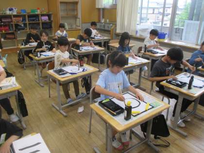 硯に墨液を出すだけでもおっかなびっくりの子供たちでしたが、書き始めると、真剣な顔で取り組んでいました。