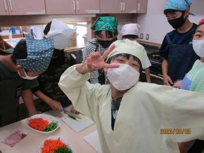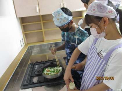 3組、調理実習の様子です!バランスのよい朝食を目指して、今回は「いろどり炒め」を作りました!