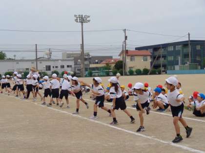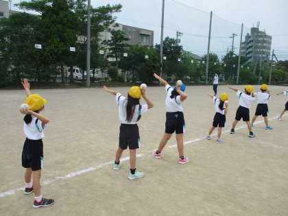 体力テストに向けて、ソフトボール投げの練習をしました。足の向きや開き方、腕の振り方を意識して取り組みました。