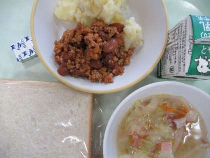 チリコンカンの語源は、スペイン語で「チリ」はとうがらし、「カン」は肉を意味します。日本語にすると、「お肉と唐辛子で煮た料理」という意味になります。給食では、辛さを控えめにしていますので、安心していただくことができます。
