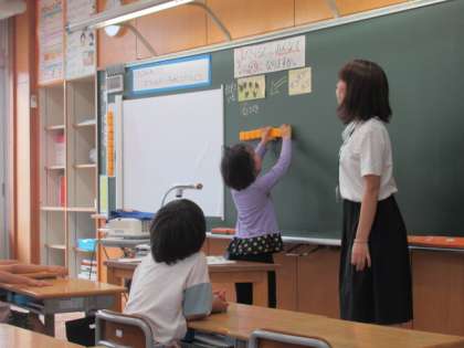 算数「ふえるといくつ」の学習で、算数ブロックを動かしながら問題を確認して、式に表しました。たくさん発表をしたり、丁寧に式に書いたりして、とてもよく頑張っていました。