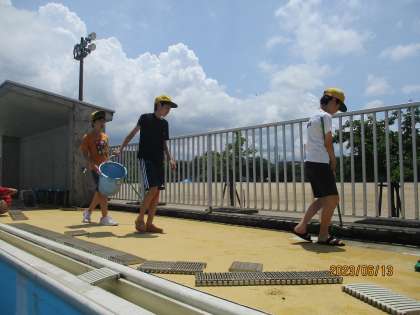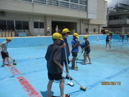 プール開放に向けて、6年生がプール清掃を行いました!プールの隅々を綺麗に磨きました!