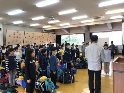 自然の家に到着しました。入所式で代表の子供が立派に挨拶をしました。