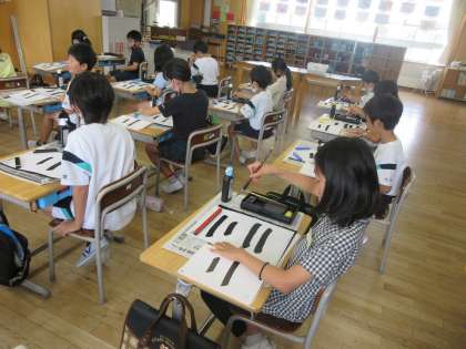 筆の使い方に気をつけて、横画の練習をしています。手本をよく見ながら「二」を丁寧に書きました。