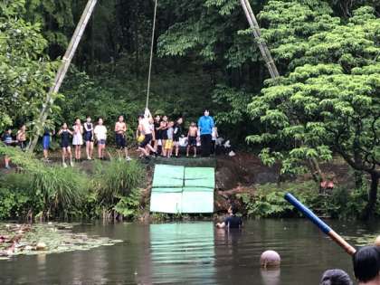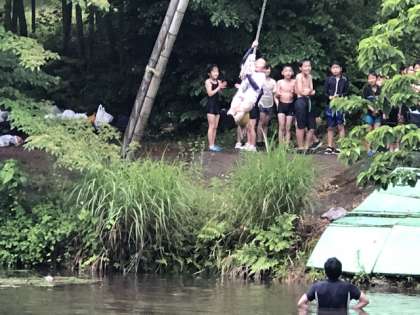 天候の急変に配慮して竹ジャングルは取り止めとし、ターザンロープといかだ遊びのみ行いました。ターザンロープでは、ロープに向かう友達を応援する声が、いかだでは声を掛け合って進路をコントロールする声が響き渡りました。楽しい活動となりました。
