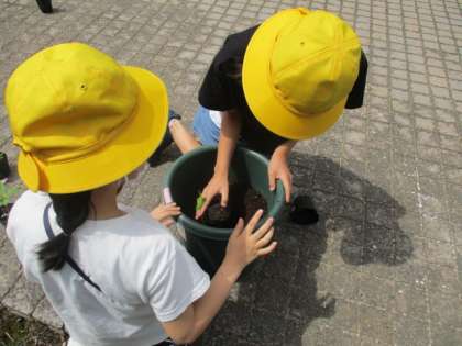 ピーマンとホウセンカの苗を植え替えました。ピーマンの生長が一番遅いねと話していました。