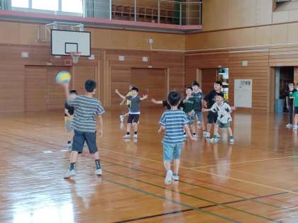 さんさんタイムや昼休みにドッジボールを楽しむ子供たち。暑くても元気です。