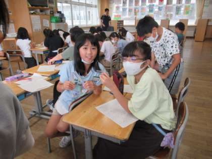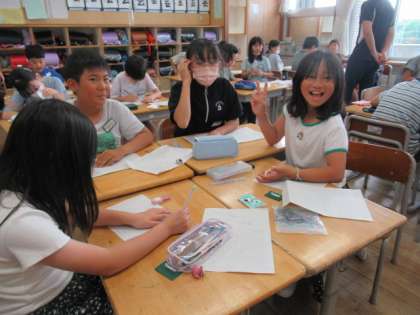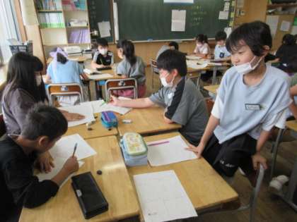 各自で下書きをし、その後読み合ってアドバイスをし合い、清書した後、合体させていきます。今日は、グループでの活動です。