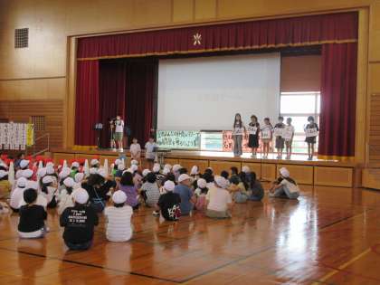 縦割り班ごとに集まって、集会がありました。お話ゲームを楽しみながら、同じ班の人の顔と名前を覚えました。どの班からも笑い声が聞こえてきました。