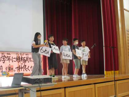 今年度、一回目の児童集会がありました。5年生らしく6年生のサポートをしたり、場を盛り上げようとしたりしていました。とても楽しい集会でしたね。