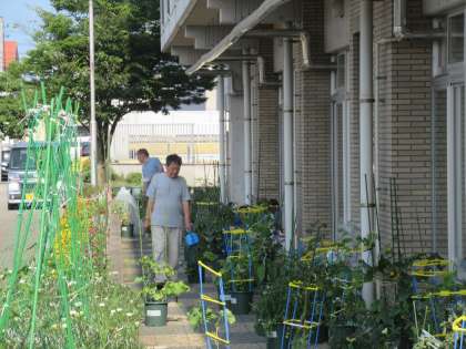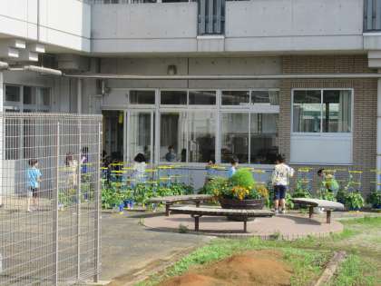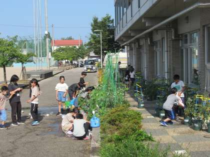 登校した子供たちは、さっそく活動を始めています。一人一鉢の野菜やアサガオにお水をあげる子、へちまの観察をする子、それぞれに目当てをもって取り組んでいます。
