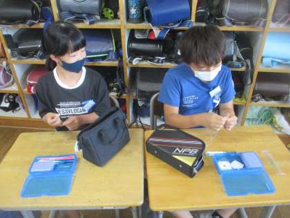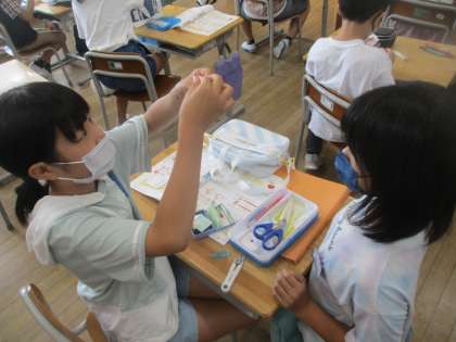 家庭科で裁縫の学習が始まっています。今日は針穴に糸を通したり、波縫いを練習したりしました。玉結びや玉留めに苦戦しながらもがんばる子供たちでした。