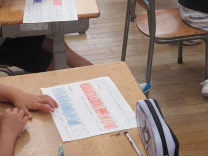 長さと同じく、量についても正しくはかるためには、基準となるものが必要です。今日は、水筒に入った水の量を比較する活動を通して、子供たちは気付いていくことができました。この日の授業は、3週間教育実習のために来校していた実習生の方が担当しました。