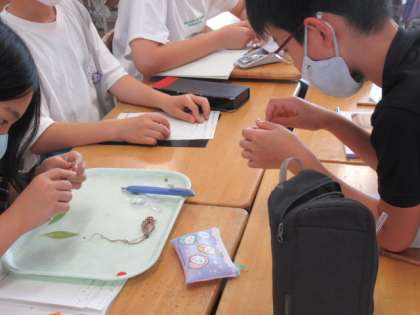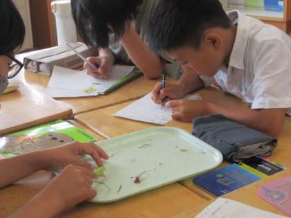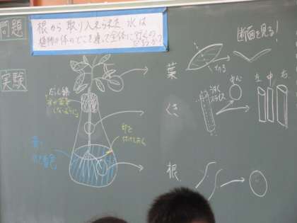 葉や茎に色水を通して予想したことを確かめました。なるほど、なるほど、たくさんの発見を子供たちはしていました。