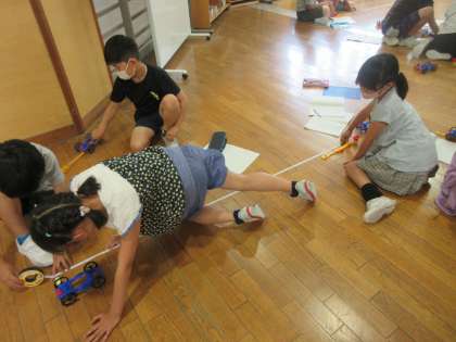 ゴムの伸ばし方によって、物を動かす働きがどのように変わるかを調べました。5cm、10cm、15cmとゴムの長さを変えて実験を進めました。