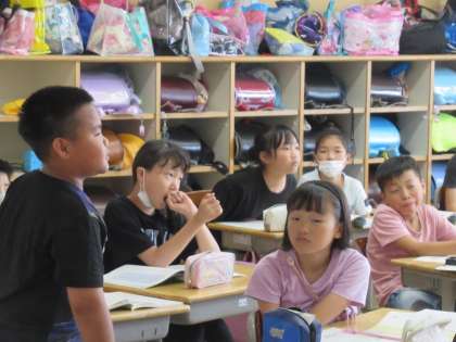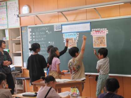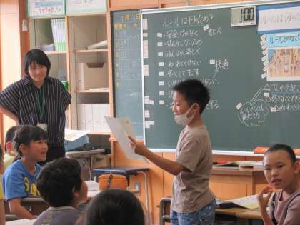 「ルールがある村」と「ルールがない村」どちらがいいか?はじめにネームプレートで自分の立場を位置付け、その後話し合いました。確かにルールは必要な場合があります。しかし、ルールによって生活が不自由なものになるのであれば、それは現実的なものではありません。子供たちなりに多角的な見方・考え方をしながら意見を交わし合うことができました。