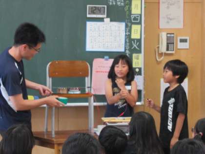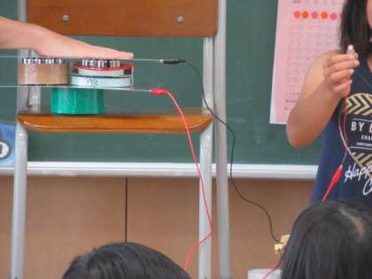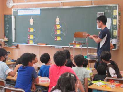 電池を32個並列につないでみました。さあ、電球の明るさはどうなるか?子供たちの興味はマックスです。