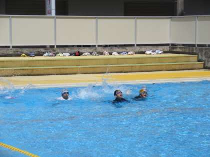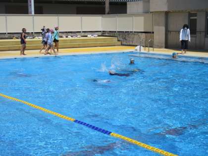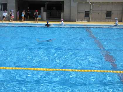 2年生では、「水遊びの楽しさに触れること」「水に慣れ、水の心地よさを味わうこと」「水の中を移動すること、もぐる・浮く等の基本的な動きを身に付けること」等を目指しています。