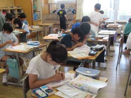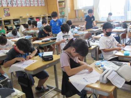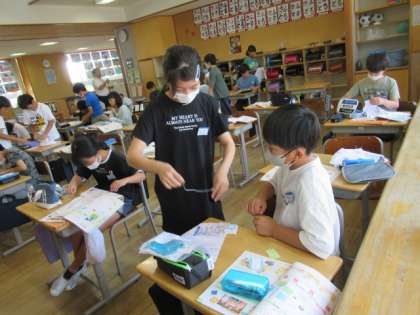 布の裏から針を差し、ボタンの穴を2〜3回通して、最後に裏で玉どめをします。練習を通して針の扱い方に慣れていきます。
