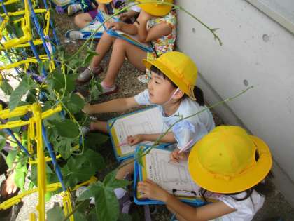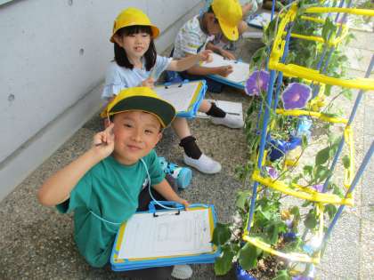 5月からお世話を続けているあさがおが花を咲かせはじめました。自分の背よりも大きくなったあさがおさんを見て、喜んでいます!きれいな色の花が咲いて嬉しいですね!