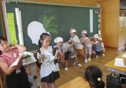 「おおきなかぶ」の音読発表会をしました。登場人物になりきって音読をしました!楽しそうな表情です!